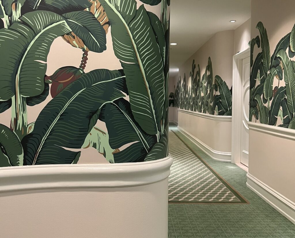 また、このバナナリーフの壁紙は、ロサンゼルスのビバリーヒルズに位置する歴史ある超高級ホテル「The Beverly Hills Hotel」(1912年創業)のホテル改装時(1949年)に、デザイナーのロン・ドーパーによって使用されたことにより、世界的なトレンドを巻き起こし、それ以来、ホテルの象徴的シンボルになりました。